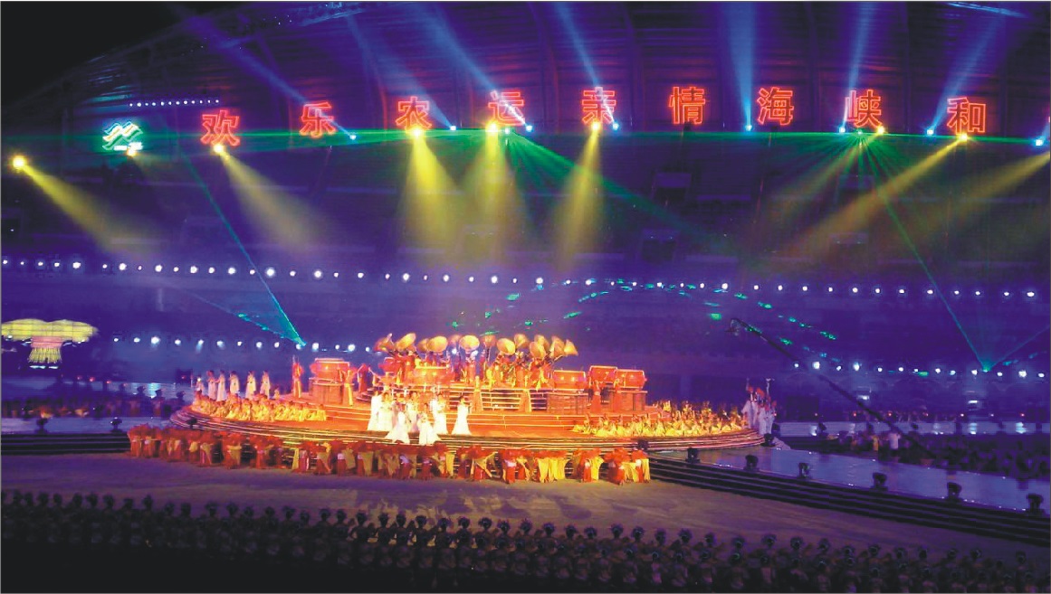綠色農(nóng)運,金色夢想。第六屆全國農(nóng)民運動會開幕式 2008年10月26日晚在泉州海峽體育中心舉行,這是和