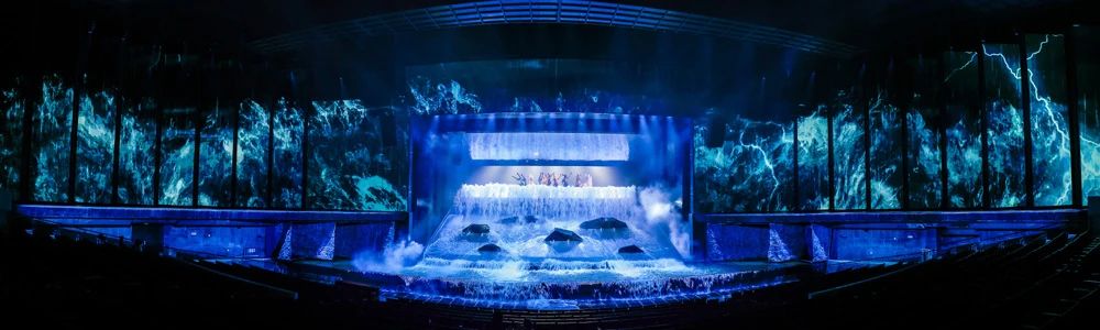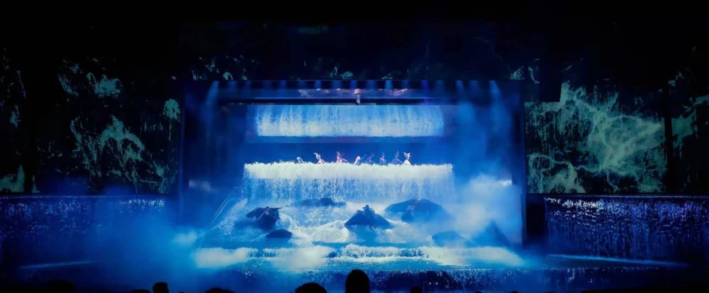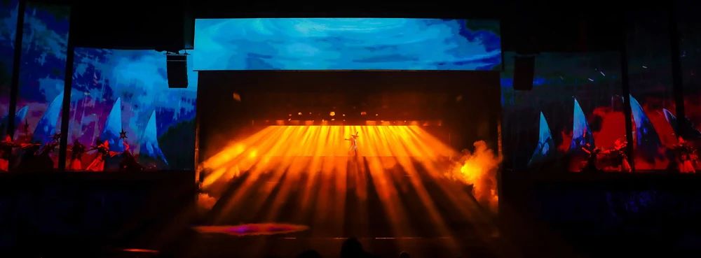 全新改版升級(jí)的《金面王朝》由《降生》、《奇緣》、《繼位》、《征戰(zhàn)》、《獻(xiàn)祭》、《王朝》六大篇章組成。舞臺(tái)舞美創(chuàng)新是本次《金面王朝》升級(jí)改造的一大亮點(diǎn):400余盞舞臺(tái)燈具,686平米P3高清4K LED屏幕,4臺(tái)31K流明高清投影儀,打造180度沉浸式舞臺(tái)。