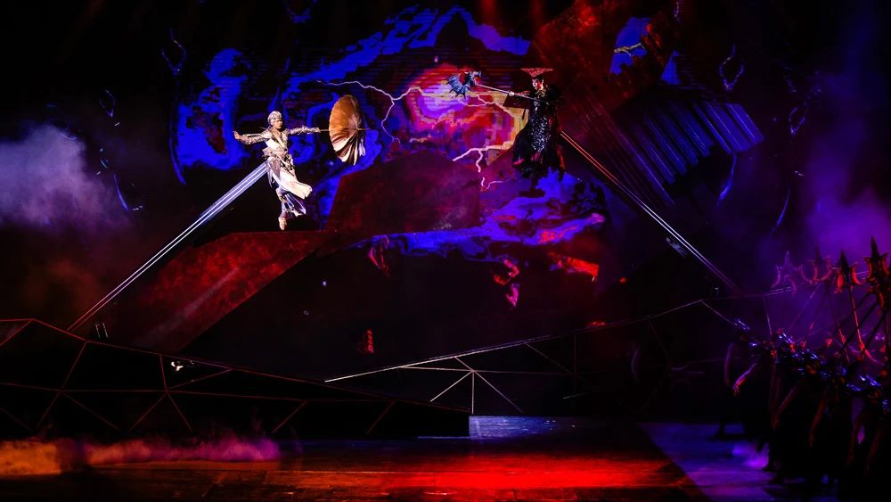 5月28日,北京歡樂(lè)谷大型東方神話(huà)秀《金面王朝》在華僑城大劇院煥新歸來(lái)。