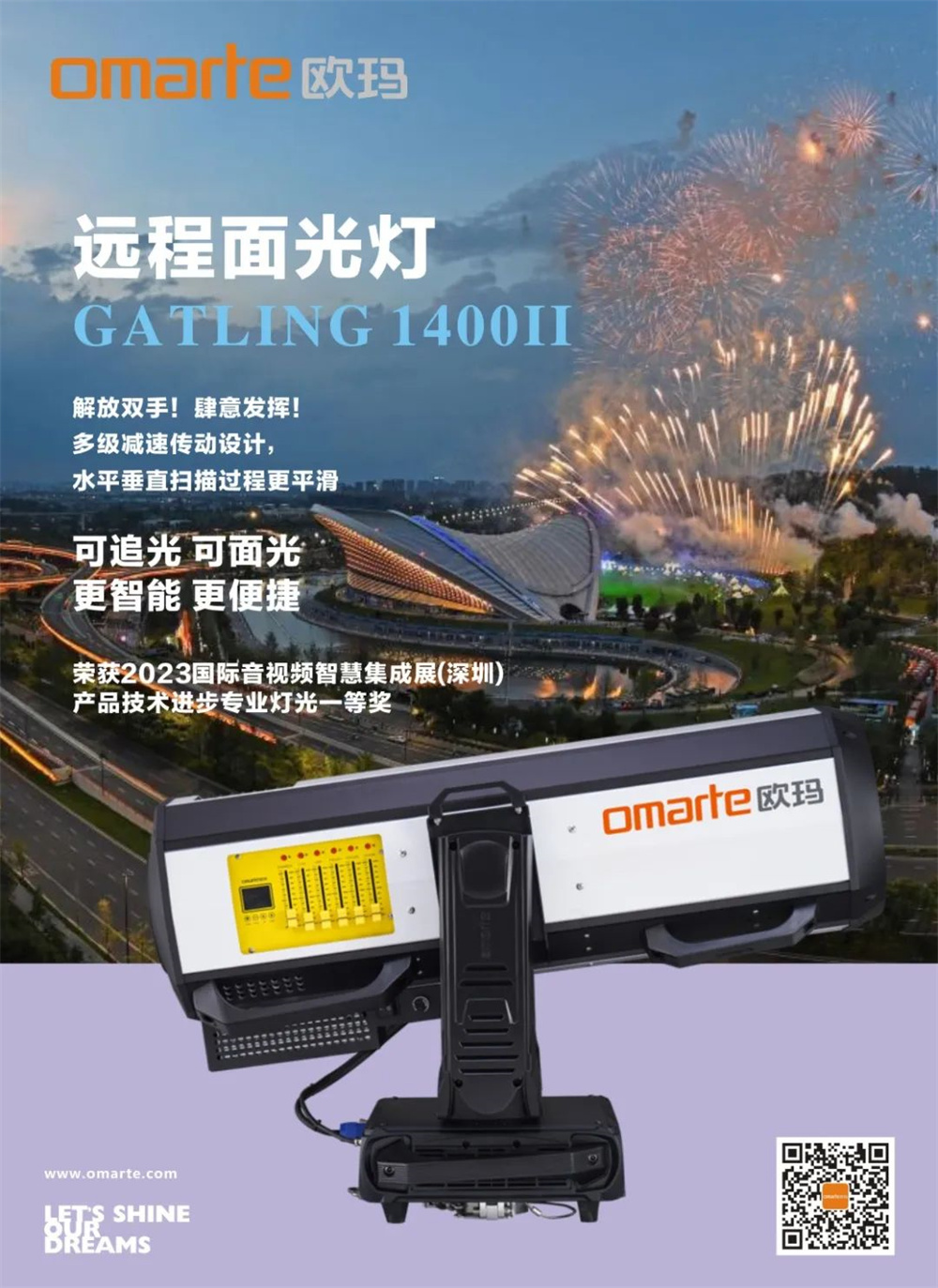 閉幕式上,歐瑪遠(yuǎn)程面光燈(Gatling 1400II)以光效性能優(yōu)越、光位靈活多變?yōu)閮x式添加光彩。