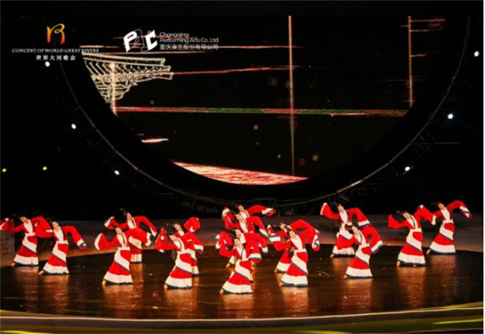 舞臺為一正一副兩個舞臺,面積共700多平方米,并安裝有600余臺燈具。整個舞臺呈半圓形,輔以多塊大型的弧形熒屏,讓現(xiàn)場舞臺具有如大河般的波浪感、立體感。