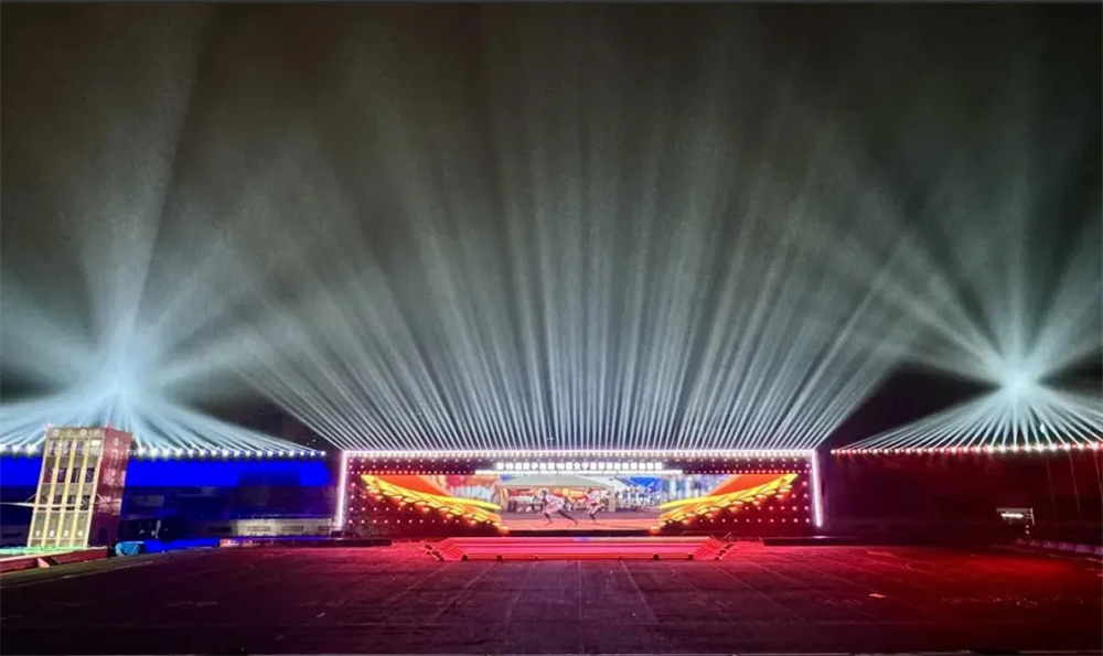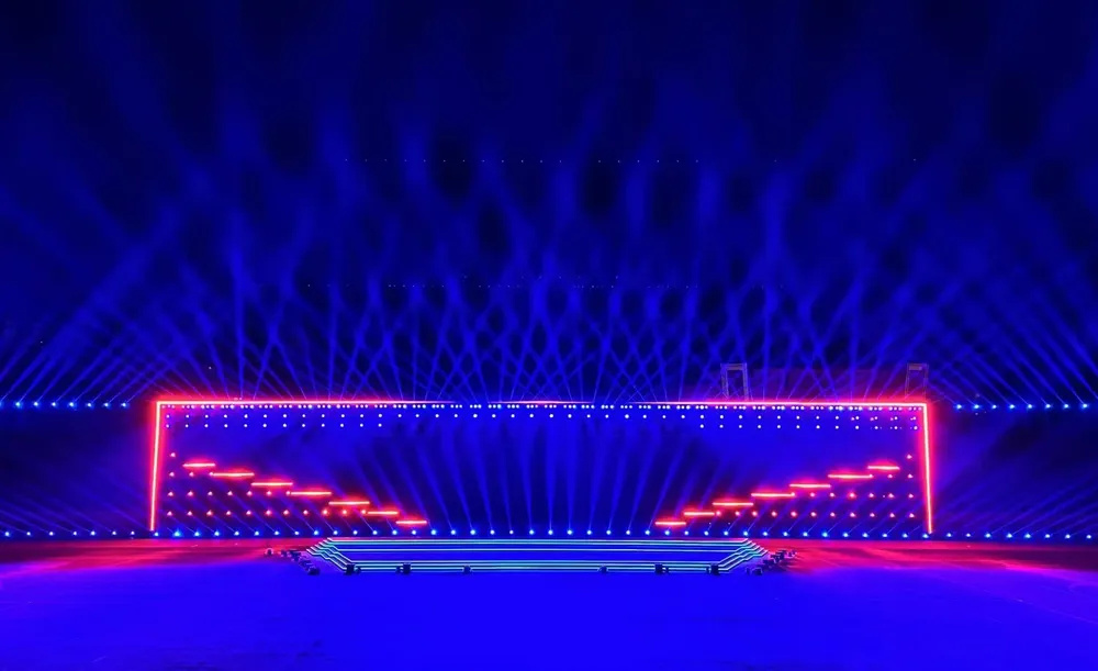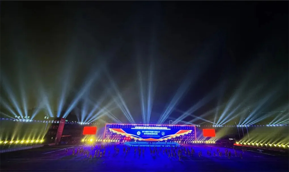 活動場地選擇在哈爾濱商業(yè)大學體育場,作為傳統(tǒng)的體育場,跨度比較大,只能運用側(cè)光和逆光來完成燈光的呈現(xiàn)和與節(jié)目的配合。同時為了保證主席臺與看臺的面光,燈光設計團隊采用了全場在看臺上搭建環(huán)形網(wǎng)架的結(jié)構(gòu)方案,運用切割燈、超遠程面光燈補充場地的面光與側(cè)光。主舞臺區(qū)域搭建了一組與場地長度接近的矩陣結(jié)構(gòu),在結(jié)構(gòu)上運用了電腦搖頭燈,搖頭染色燈等,極大程度的滿足各個區(qū)域觀眾的觀感,同時也運用了一些燈帶,勾勒出舞臺的線條,以此營造浪漫唯美的現(xiàn)場氛圍。