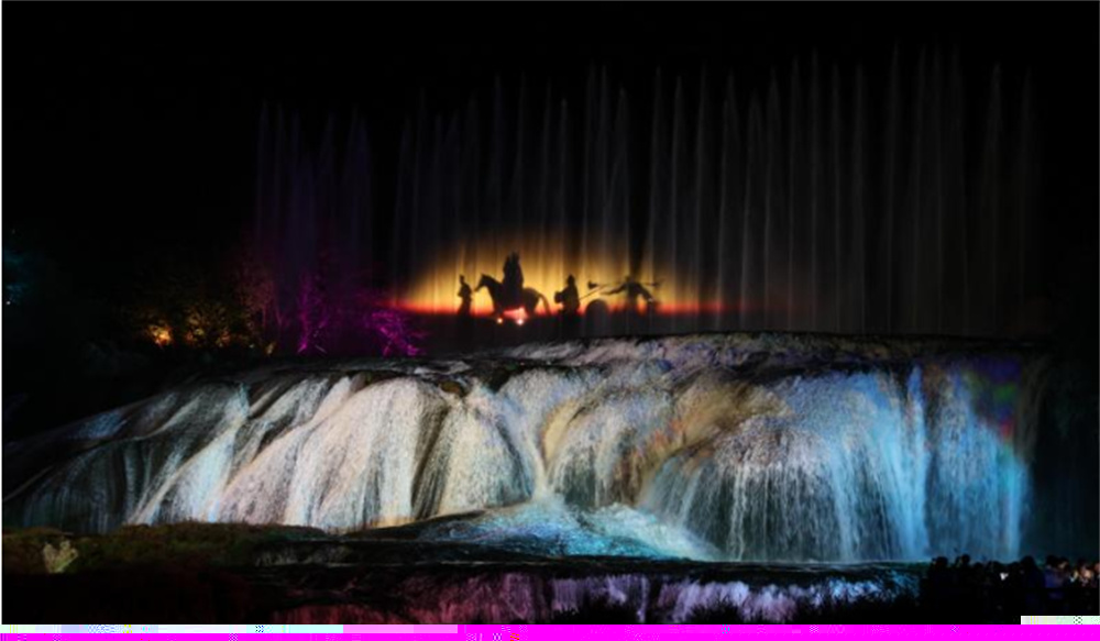 作為86《西游記》片尾曲中師徒四人牽馬跋涉的取景地,陡坡塘瀑布承載著一代人的熒屏記憶。此次《再回西游》項(xiàng)目以瀑布為核心舞臺(tái),依托山體、水幕、密林等自然景觀,結(jié)合全息投影、激光矩陣、霧森系統(tǒng)等前沿技術(shù),將《西游記》中一系列經(jīng)典片段逐一復(fù)刻。游客穿行于光影交織的山水之間,仿佛置身于神話與現(xiàn)實(shí)交錯(cuò)的平行時(shí)空。