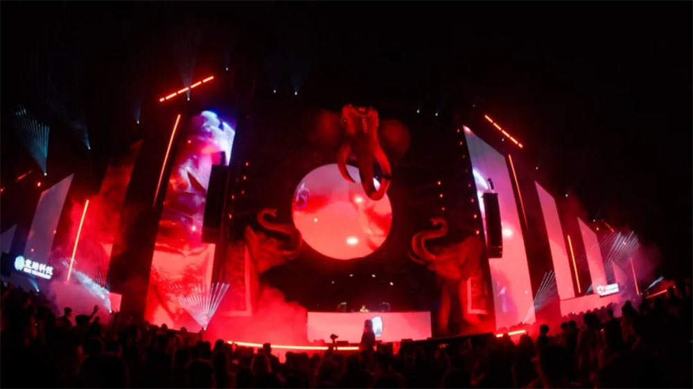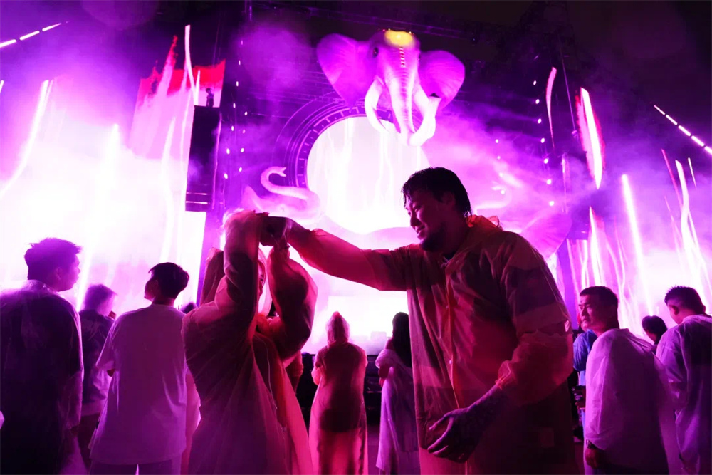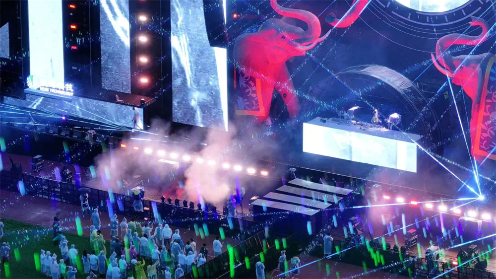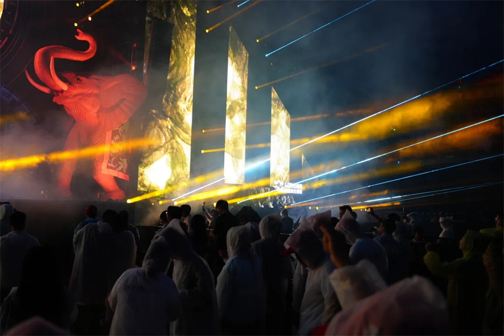 這場電音節(jié)不僅僅是一場視聽盛宴,更是一次文化交融與創(chuàng)新的實踐。通過精妙的光影設(shè)計,將西雙版納的傳統(tǒng)文化元素與現(xiàn)代電音舞臺完美融合。當(dāng)雨林戰(zhàn)神象圖騰” 舞臺上的巨型神象雕塑在燈光的渲染下,從古樸神秘變得栩栩如生,仿佛穿越千年時光,訴說著這片土地的傳奇故事;用光影為傳統(tǒng)文化注入新的生命力,讓其在現(xiàn)代科技的舞臺上綻放出更加絢爛的光彩。