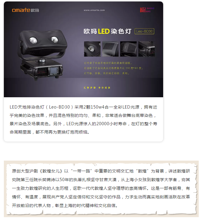 這部劇完美的將聲、光、人、景融為一體,以燈光為筆,唯美的場景配合震撼的音樂,讓整個舞臺自然流露出大漠敦煌的東方意境。該劇燈光設計邢辛老師、舞美設計劉杏林老師,《敦煌女兒》選用了歐瑪燈光LED天地排染色燈(Leo-BD30),簡潔質樸的舞美燈光,高度還原敦煌壯美。
