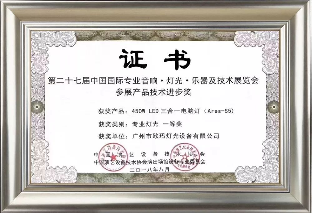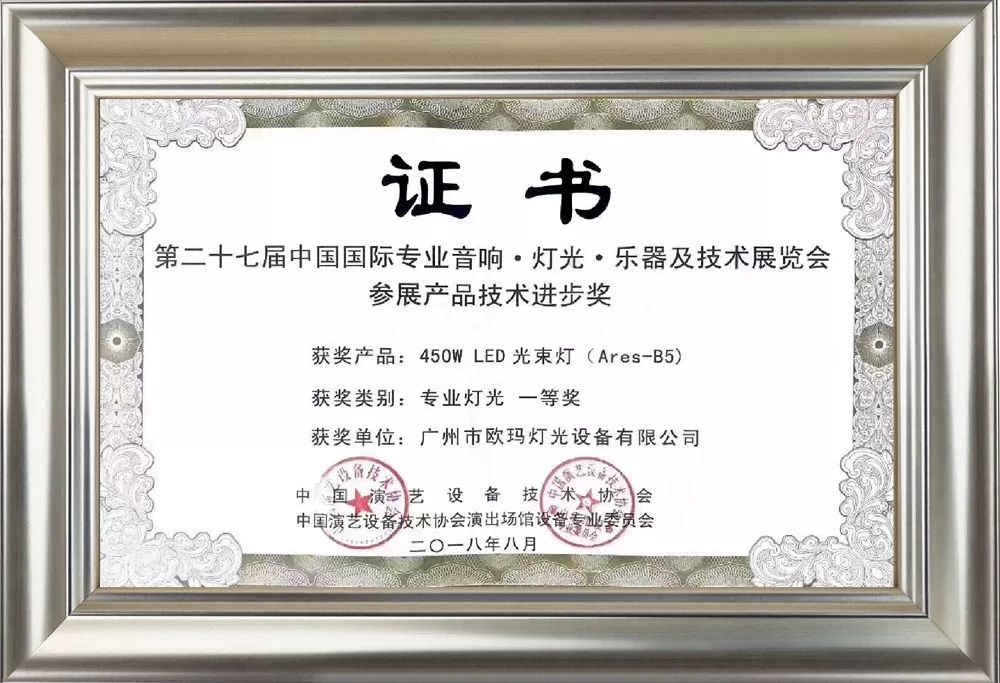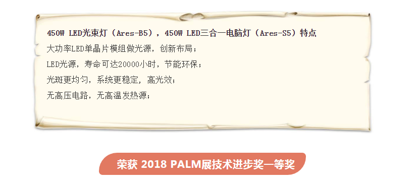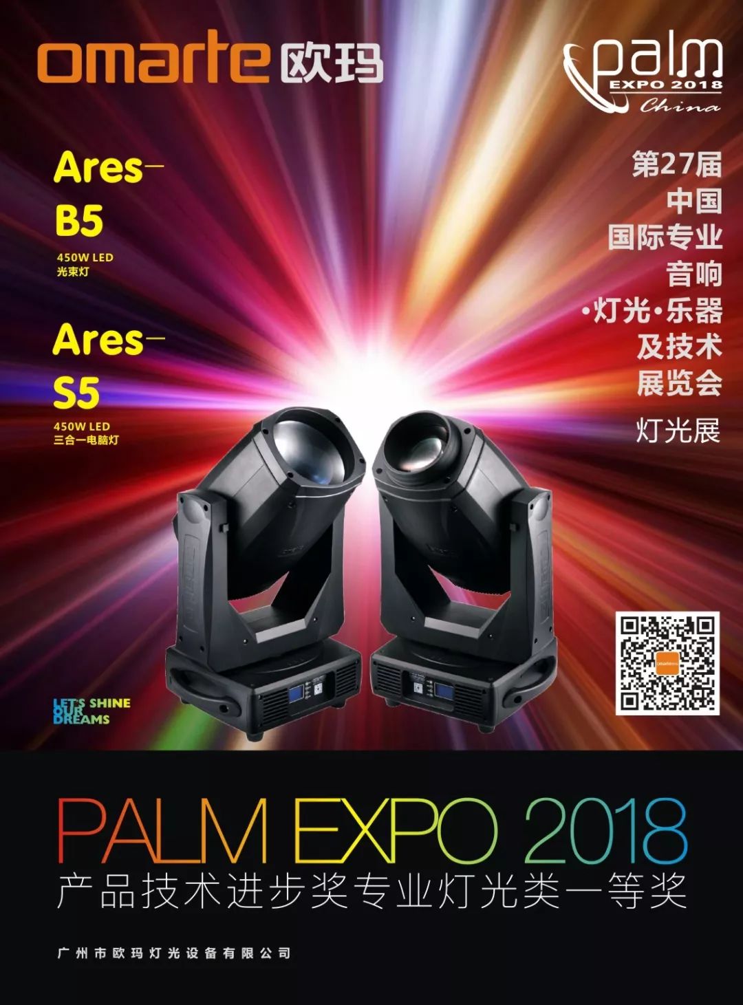 PALM EXPO 2018,歐瑪燈光實(shí)力認(rèn)證,新品450W LED光束燈(Ares-B5),450W LED三合一電腦燈(Ares-S5)分別榮獲了“產(chǎn)品技術(shù)進(jìn)步獎(jiǎng)專(zhuān)業(yè)燈光類(lèi)一等獎(jiǎng)”。