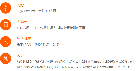 高效而出色的15w全彩4合一(RGBW)燈珠,能夠混合出你想要的無論什么顏色。LED光源驚人的20000小時壽命,在燈的整個壽命周期里面,都不用再為更換燈泡而煩惱。外置系統(tǒng)快速升級接口,可以一次性批量升級燈具系統(tǒng)。自帶獨有的隱藏式折疊燈鉤專利集成系統(tǒng)。帶有放大功能,能夠線性調(diào)節(jié)出光角。專利設計的無極旋轉系統(tǒng),在整個放大的行程中,光學模組都可以進行無極限旋轉。19顆燈珠都可以單獨控制