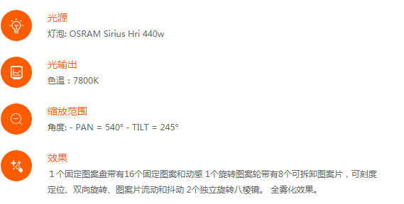采用OSRAM 440w鉑金光源,超高亮度輸出,穿透力也超強。外置系統(tǒng)快速升級接口,可以一次性批量升級燈具系統(tǒng)。自帶獨有的隱藏式折疊燈鉤專利集成系統(tǒng)。有一個帶有14種色彩的顏色盤,色彩多樣選擇多樣。1個帶有16種圖案的固定圖案盤,1個帶有8種可拆卸圖案的旋轉(zhuǎn)圖案盤,可雙向變速旋轉(zhuǎn)。1個八棱鏡和1個十六棱鏡,雙棱鏡之間相互切換,配合旋轉(zhuǎn)圖案以及豐富的顏色,給人強烈的視覺沖擊。設(shè)計獨到的散熱系統(tǒng)讓燈具更強更穩(wěn)定。