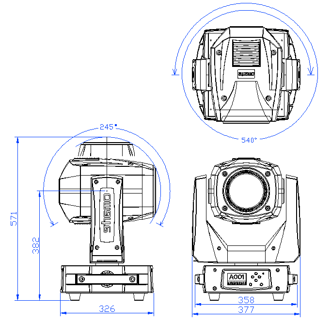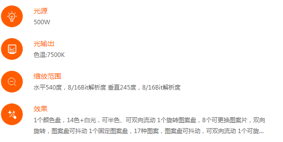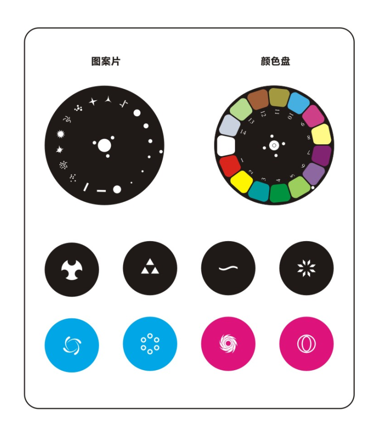 1個(gè)顏色盤(pán),14色+白光,可半色、可雙向流動(dòng) 1個(gè)旋轉(zhuǎn)圖案盤(pán),8個(gè)可更換圖案片,雙向旋轉(zhuǎn),圖案盤(pán)可抖動(dòng) 1個(gè)固定圖案盤(pán),17種圖案,圖案盤(pán)可抖動(dòng),可雙向流動(dòng) 1個(gè)可旋轉(zhuǎn)八棱鏡(十六棱鏡可選),雙向旋轉(zhuǎn) 0-100%機(jī)械調(diào)光,頻閃0.5-14次/秒,脈沖和隨機(jī)頻閃功能 漸變?nèi)峁庑Ч?染色角度5-30度